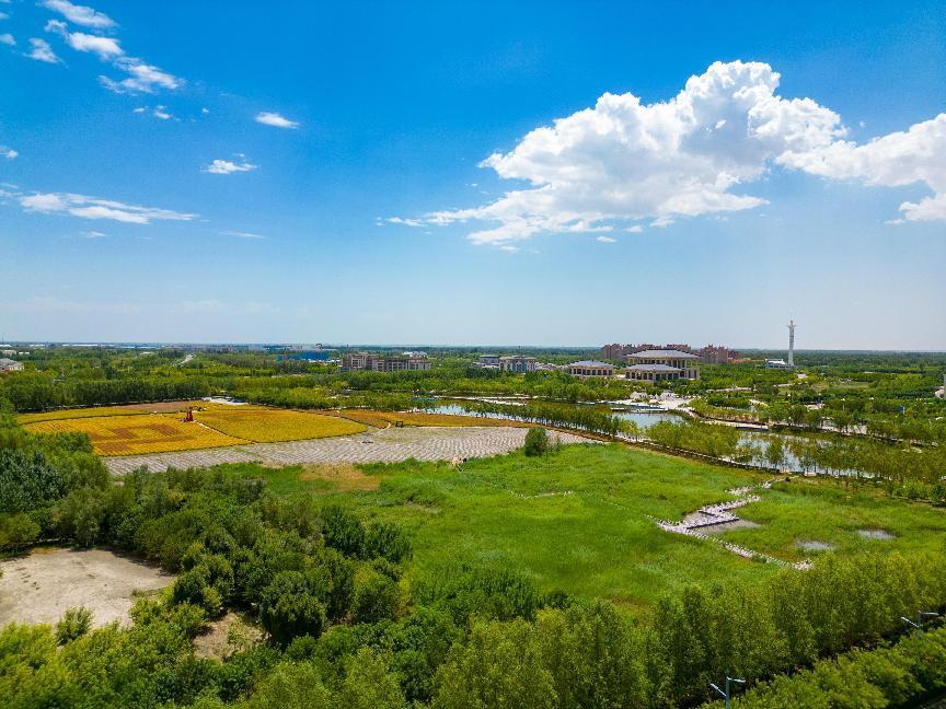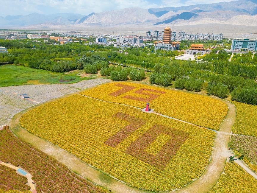 盛夏时节,从空中俯瞰铁门关市雁鸣湖体育公园,由百日菊组成的“75”“70”数字造型格外醒目,营造出庆祝新中国成立75周年、兵团成立70周年的喜庆氛围。以紫色百日菊为主色调的数字与以黄色百日菊为主的“画布”共同构成了一幅生动的画面,吸引了不少市民和游客畅游其中。(苏江生)