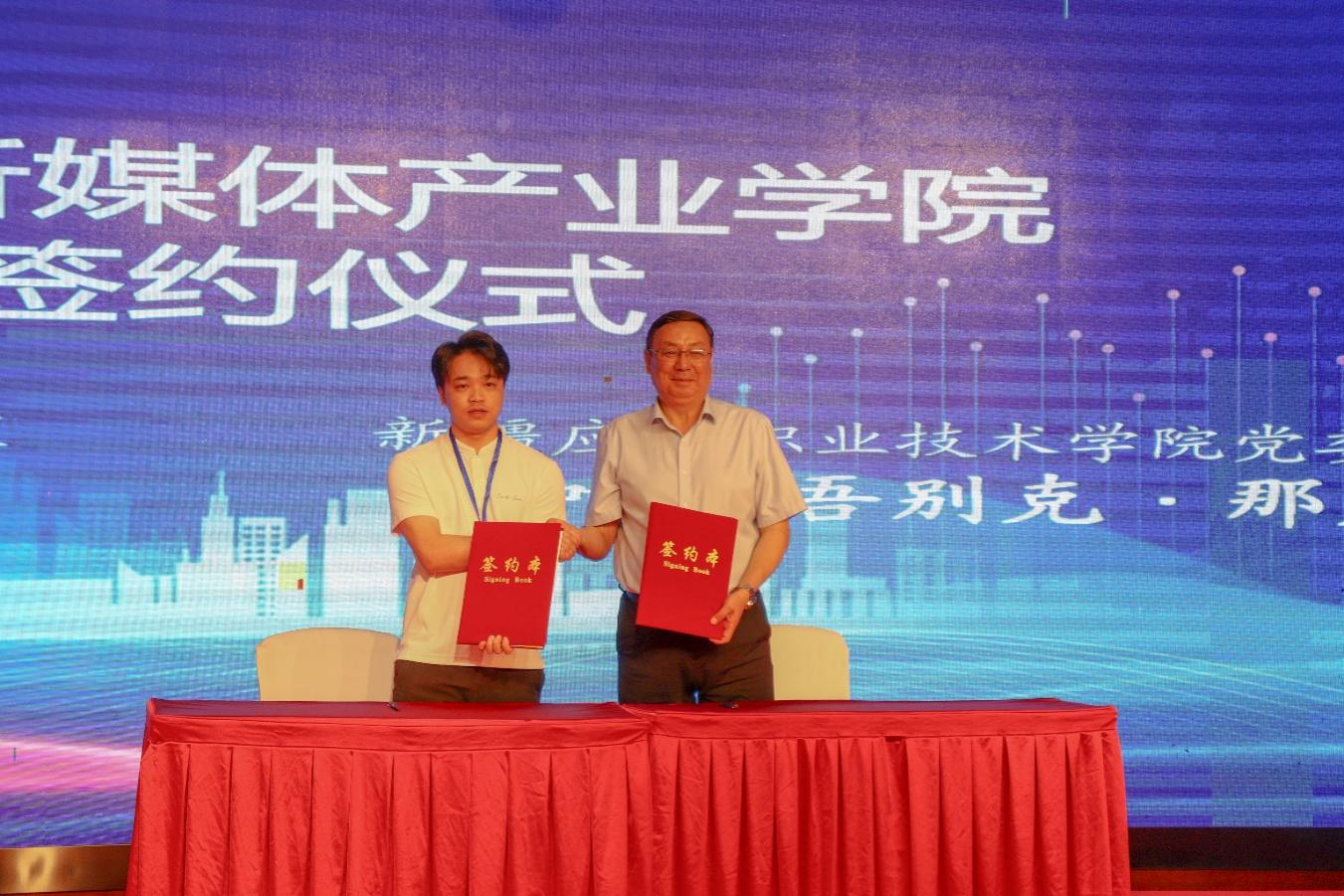 新疆应用职业技术学院与广州风韵文化传媒有限公司、甘肃烁光科技有限公司签订《风韵新媒体产业学院协议》《数字媒体开放型区域产教融合实践中心协议》。签订共建协议,是各方共同推动数字文化产教融合的坚定承诺,更是为培养高素质数字文化人才、促进产业创新发展而携手共进的有力见证。