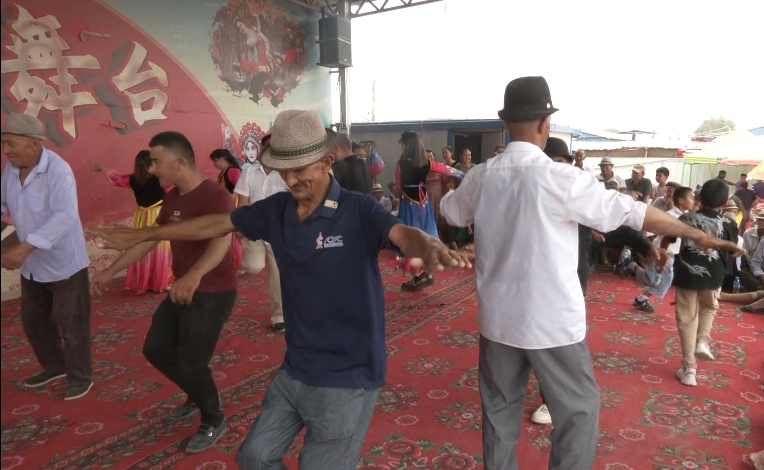 在麦盖提县沙漠明珠农贸市场,昂格特勒克乡文艺演出队队员们激情饱满,身着色彩艳丽的服饰,在舞台上载歌载舞,观众们热情高涨,不时欢呼喝彩。一支支轻盈优美的舞蹈,一首首耳熟能详的经典歌曲,表现出了各族群众对新时代美好生活的热爱,也展现了大家爱国爱党、昂扬向上的精神面貌。