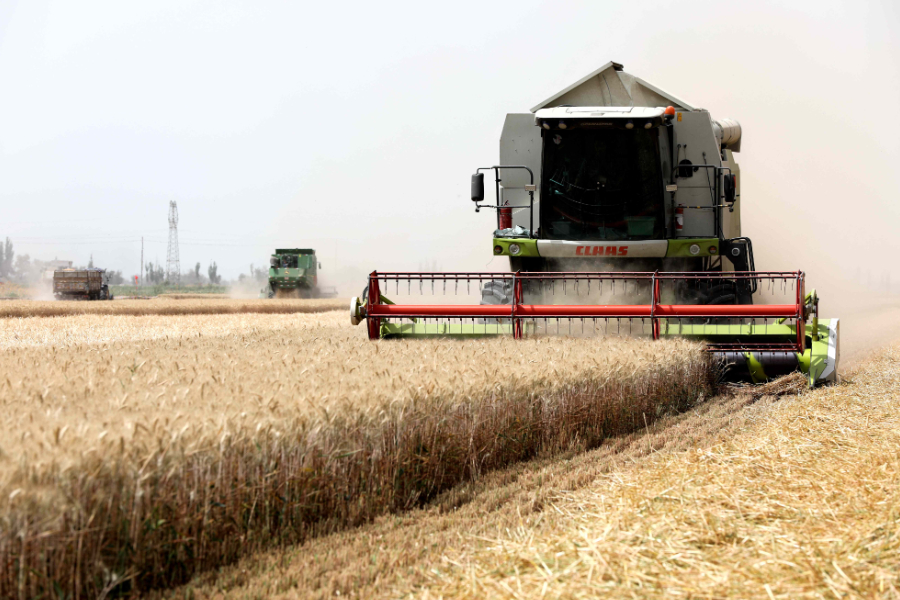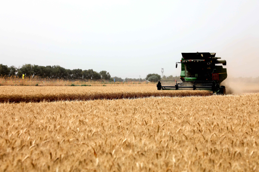 联合收割机正在收割小麦。林国强摄