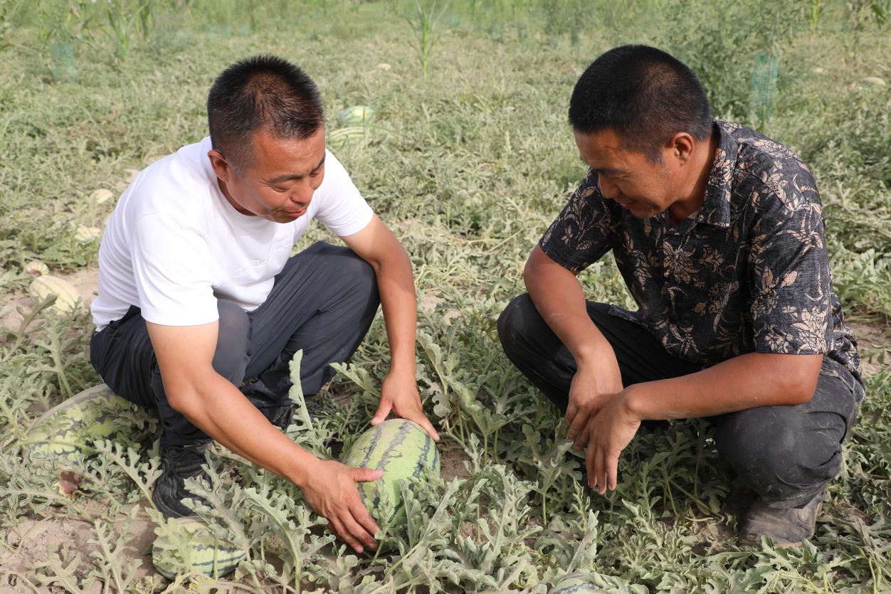 杨建国(右)和姜延付交谈西瓜种植情况。朱志升 摄