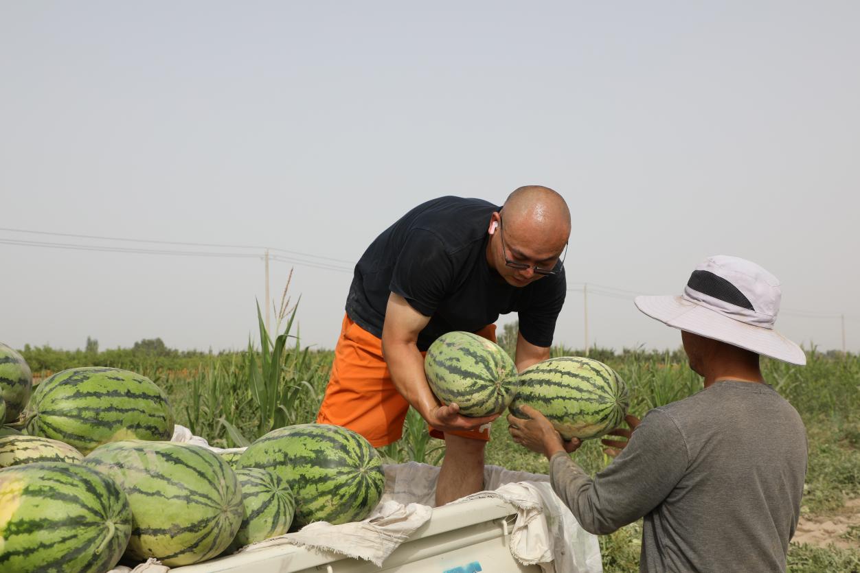 客商罗成(左)正在往车上装西瓜。朱志升 摄