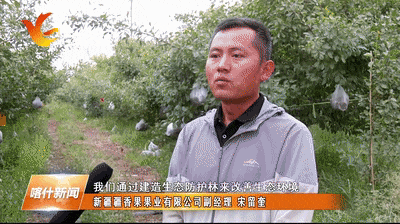 新疆疆香果果业有限公司副经理宋留奎:为了防沙治沙,我们通过建造生态防护林来改善生态环境。目前,种植的果树总面积已达到13000亩,形成了一片广阔的生态林。