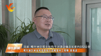 喀什地区林业和草原局生态修复科工程师黄海波:目前,喀什地区塔克拉玛干沙漠边缘总长度约372公里,有森林、草地、湿地防护的长度约348 公里、占93.55%。下一步,我们将坚持山水林田湖草沙一体化保护和综合治理,为筑牢我国北方生态安全屏障作出喀什贡献。