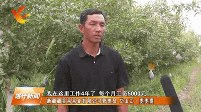 新疆疆香果果业有限公司管理员艾山江·麦麦提 :我在这里工作4年了,每个月工资5000元,主要是管理新梅林,每天跟其他员工一起管理新梅。建造这个新梅林后,生活环境也好了,我们很高兴。