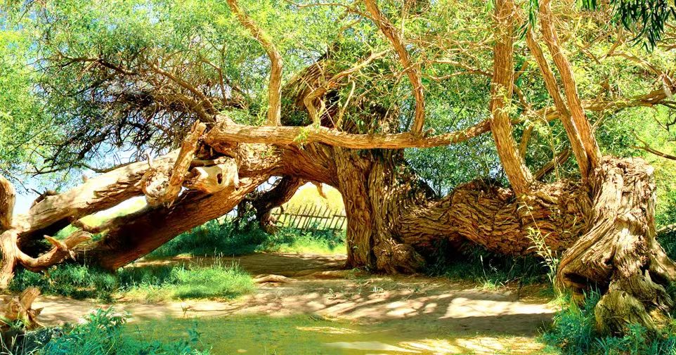 顽强的生命力,在温宿这片土地被诠释的淋漓尽致。沿着托什干河向东,走进天山神木园这颗戈壁明珠,仿佛走进了一个古老的神话世界。千年古树姿态万千,有的相互依偎,宛如亲密的老友在倾诉着岁月的故事;有的独自挺立,像是坚守着千年的承诺。阳光透过树叶的缝隙,洒下斑驳的光影,草地上的露珠闪烁着晶莹的光芒,仿佛是大自然洒下的珍珠。草地下泉水汩汩的流淌,也不知这地下遍布着多少泉眼,千百年来孜孜不倦的流淌,滋润着这方土地,让这些古树肆意生长,生生不息。