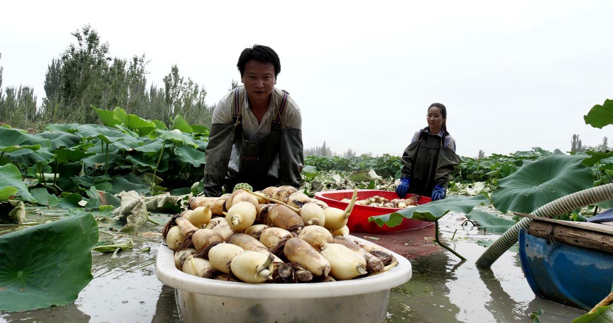 彭刚从事莲藕种植业已有五年之久。五年前,他看好温宿县得天独厚的水土光热资源条件,从内地引进了36个不同品牌的莲藕,在稻田进行试种。经过精心培育与筛选,最终确定了新35号莲藕最适合当地种植。