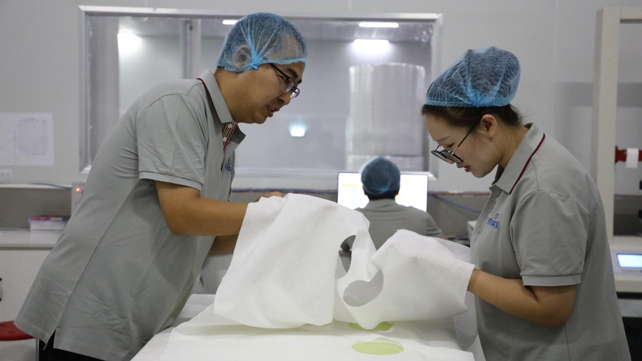 该公司副总经理贾宁宁说:“目前,我们的产品基本应用于民用的日常消耗品,主要包括洗脸巾、棉柔巾、湿巾等,还有一些消毒湿巾。未来,我们的生产线会做一些类似于卸妆棉、化妆棉之类的高端产品,包括其他的一些产品的面层、表层等,一步步向生产更高端的产品努力。”