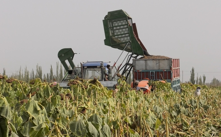 走进麦盖提县尕孜库勒乡塔拉买里村,历经数月的阳光雨露,一棵棵向日葵形似“金盘子”,沉甸甸的花盘将枝干压弯了腰,向日葵收割机在地里来回穿梭,脱粒、筛选、装车……顷刻之间,一粒粒饱满的葵花籽就如小山般堆在了车斗之中。
