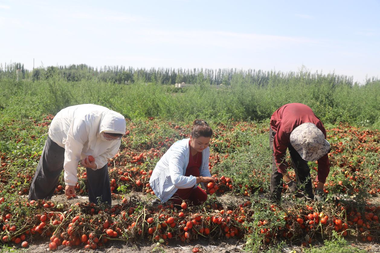 温宿县阿热勒镇农民采收西红柿。张浩 摄