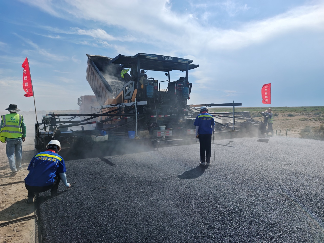 8月5日,记者来到十师北屯市—182团—黄花沟公路项目一标段施工现场看到,整个建设场面紧张有序,摊铺机匀速前进、压路机来回穿梭、运输车有序倒料,工人们正在对摊铺碾压质量进行检查及路面覆盖,施工现场一片繁忙。