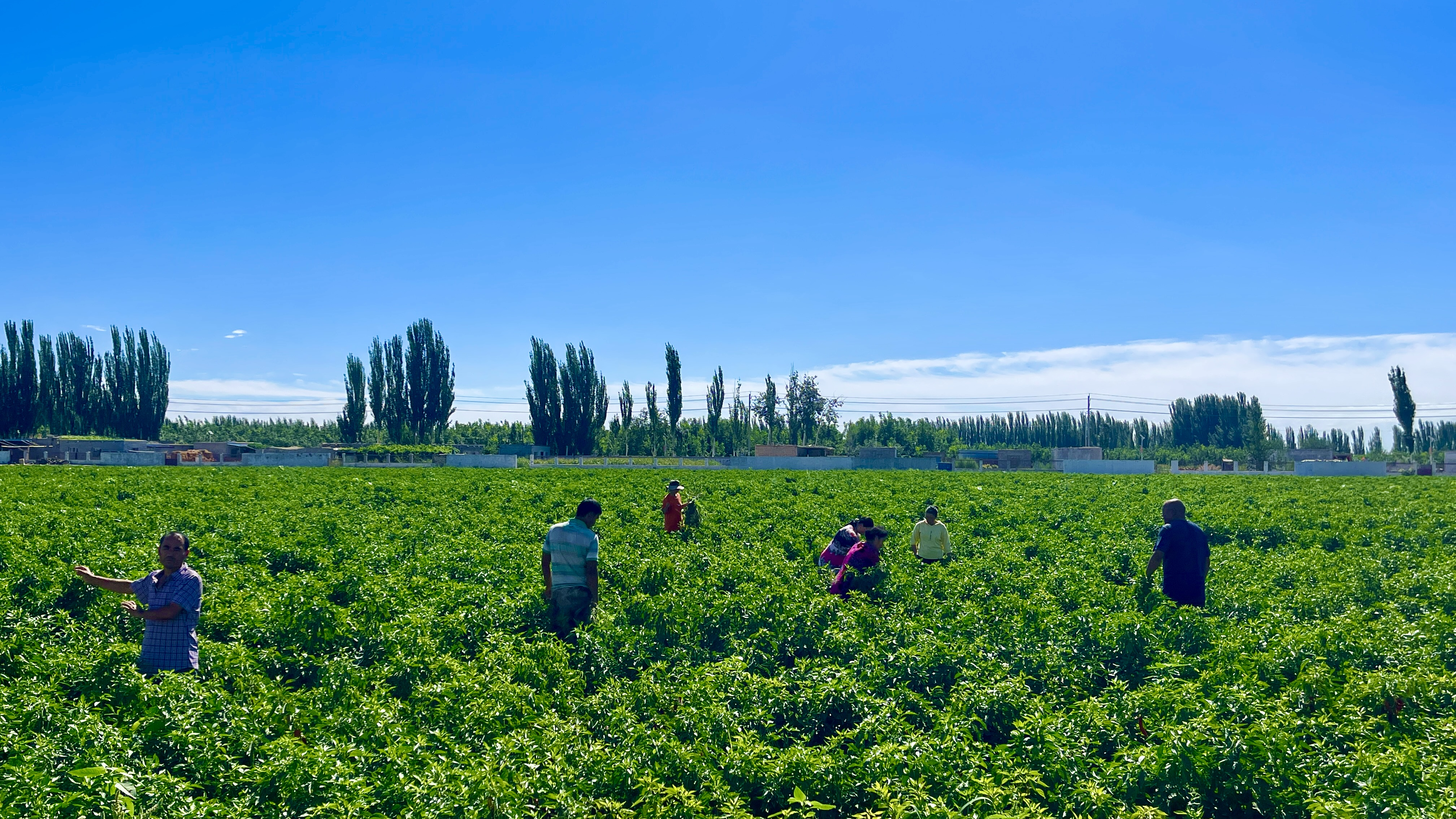 (站在丰收的辣椒地里,农户们脸上满是笑意 古丽迪雅尔·艾尼瓦尔 摄)