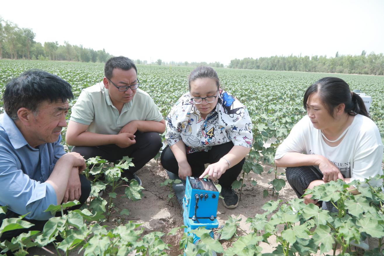 在智慧农业棉田,技术人员给农户讲解电磁阀的操作办法。石继良 摄