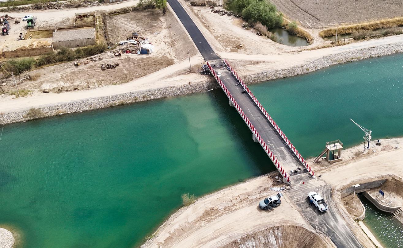 一连与阿瓦提县多浪乡英买力村同处塔里木河源头,中间隔着连通上游水库和胜利水库的塔南总干渠。一连地处干渠以北,英买力村地处干渠以南,两地直线距离3公里,绕行要走20公里。为了缩短两地距离,2023年9月,经十六团新开岭镇和阿瓦提县实地核查评估,台州市援疆指挥部投入援疆资金500万元,一座总投资近710万元,跨度60米、宽5.5米的兵地共建“连心桥”正式开建。如今,“连心桥”已通车。