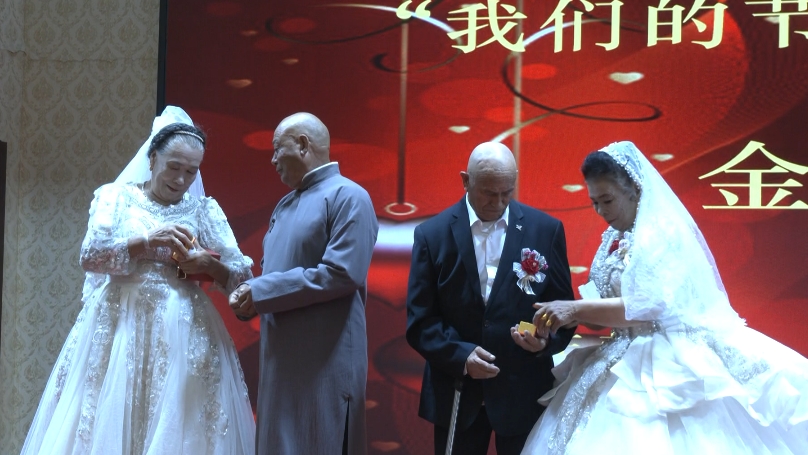 活动现场,伴着优美的音乐旋律,来自各乡镇9对金婚、银婚夫妇身着礼服、婚纱,在现场观礼嘉宾和亲朋好友们的见证和祝福下,交换礼物重温婚姻之路,回味过去50多年来风雨携手相伴的心路历程,传达了他们相伴一生“相互包容、相互理解、相互扶持”的理念。工作人员为9对老人颁发了纪念品和礼品,进一步弘扬中华民族“敬老、尊老、爱老”的传统美德,充分展示了新时代老年人的精神风貌和幸福生活,增加了老年人的晚年幸福感。