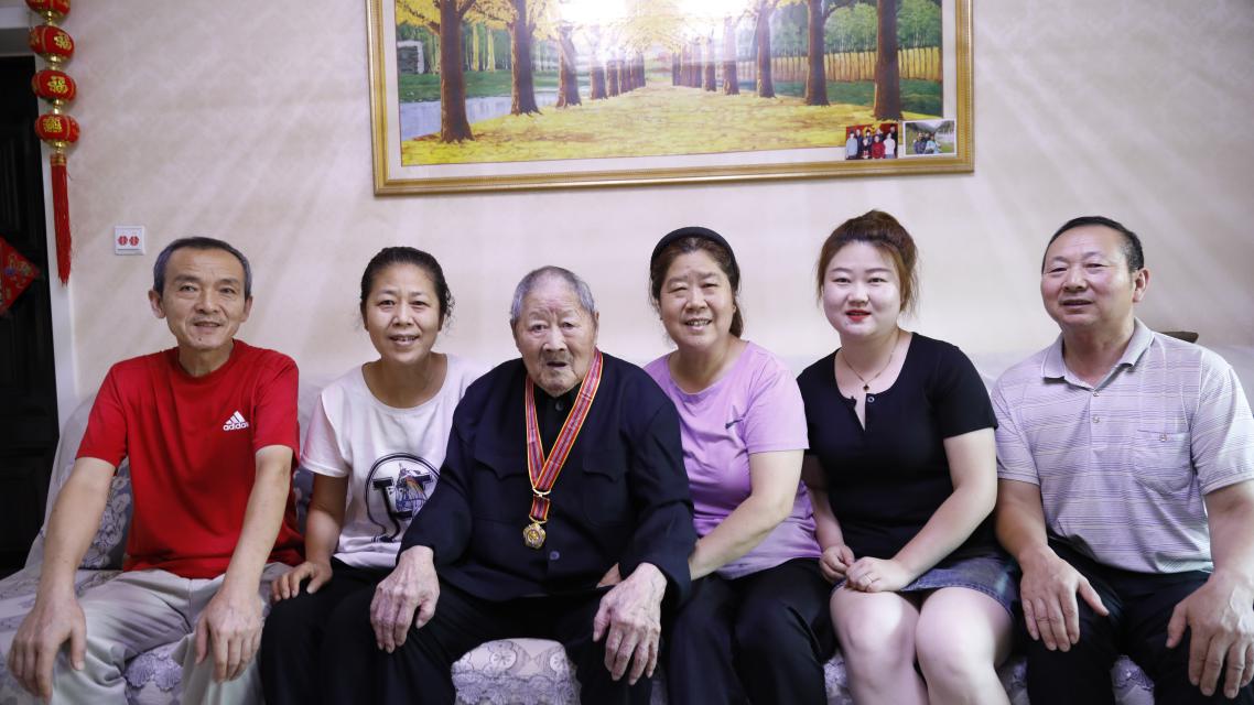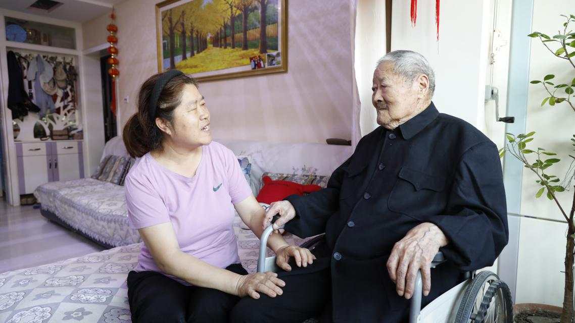 贾书钦向女儿贾新红讲述自己抗美援朝的经历。宋冰 摄