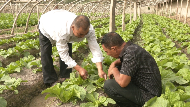 走进麦盖提县巴扎结米镇阔什艾肯村村民熊裴然家中,熊裴然和他的好兄弟阿布都外力·吐来克正忙着给白菜除草,一棵棵青翠欲滴的大白菜长势喜人,宛如铺在地面上的绿色绸缎。熊裴然在巴扎结米镇阔什艾肯村这片土地上生活了31年,在这里他结识了他的好兄弟阿布都外力·吐来克,熊裴然因为腿脚不便,家里的重活、累活,阿布都外力·吐来克只要一有时间就会过来帮忙。