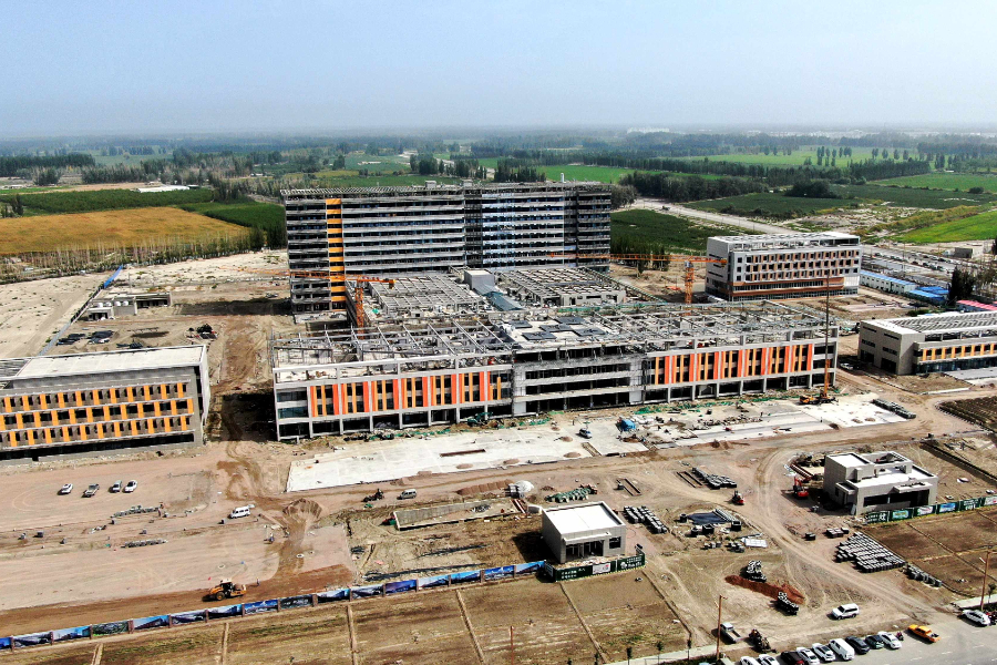 作为兵团建设的首个国家区域医疗中心项目,经过近两年的紧张建设,目前,浙江大学医学院附属邵逸夫医院新疆兵团阿拉尔医院(以下简称浙大邵逸夫阿拉尔医院)新建项目各单体工程正在进行室内外装饰装修和室外基础设施施工,后续将进行项目收尾和验收工作,预计今年10月正式交付使用。