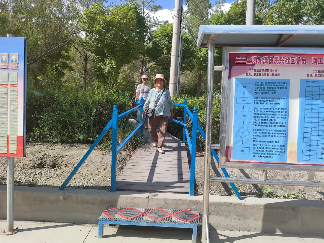 今年5月初,在二二三团民兴社区雅苑小区与农贸市场之间,架起了一座长8米、宽1.2米钢木结构的“连心桥”。