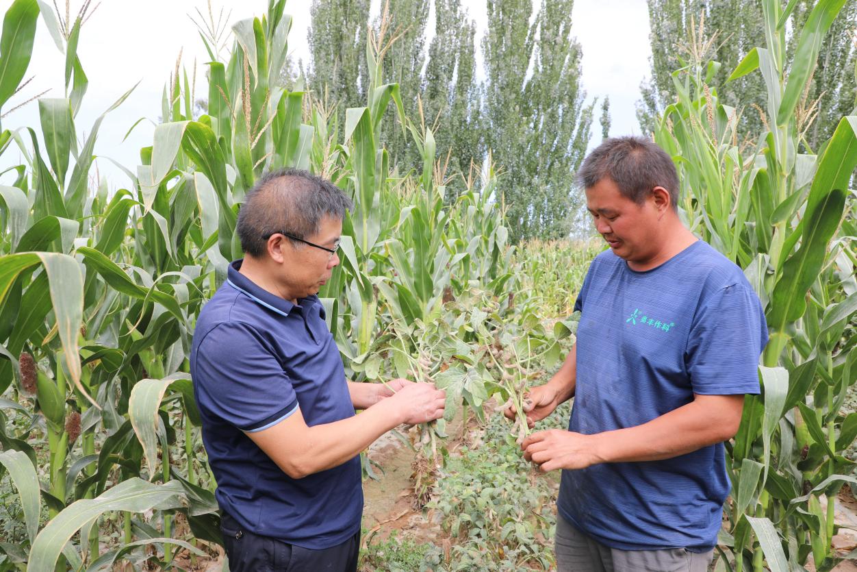 吴梦章(左)指导职工刘东东黄豆种植技术。朱志升 摄