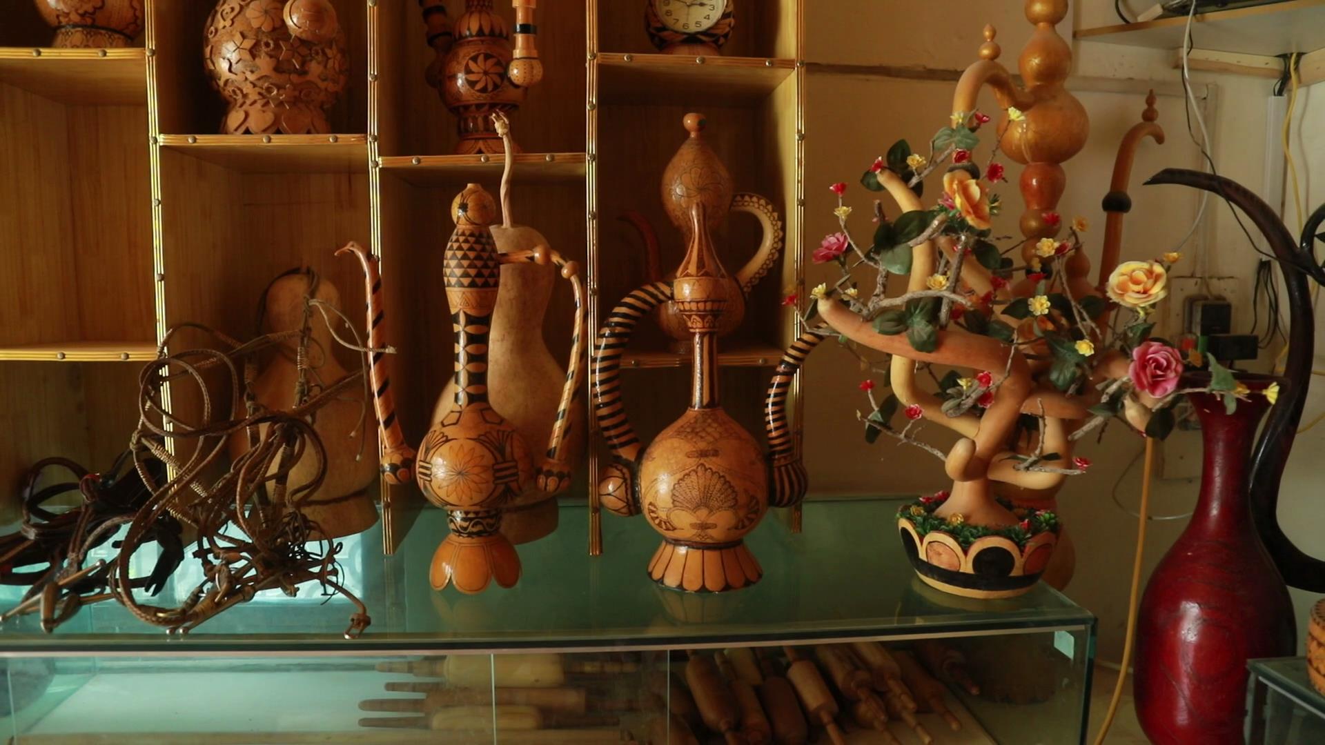 走进麦盖提县尕孜库勒乡吐普硝村工艺品农民合作社,货架上摆放着马鞍、石磨、纺纱机、茶具等各类传统手工艺品,房梁上悬挂着各式各样的葫芦烙画,其色彩鲜艳、线条流畅、构图巧妙,让人十分惊叹。