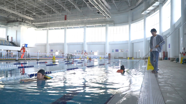 在位于沙湾市文旅中心的游泳馆内,市民费佳代正在上游泳私教课。自今年8月开业以来,文旅中心游泳馆成为很多市民健身运动、放松身心的又一选择。