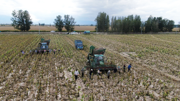 沙湾市裕康种植农民专业合作社社员禹君说:“今年我们合作社种了2800亩的食葵,今年食葵长得还是比较好的,预计1亩能达到300公斤左右,目前按照市场行情,大概在11块钱左右,我们是9月10号左右开始采的,一共出动4台采收机,预计9月底采收完。”