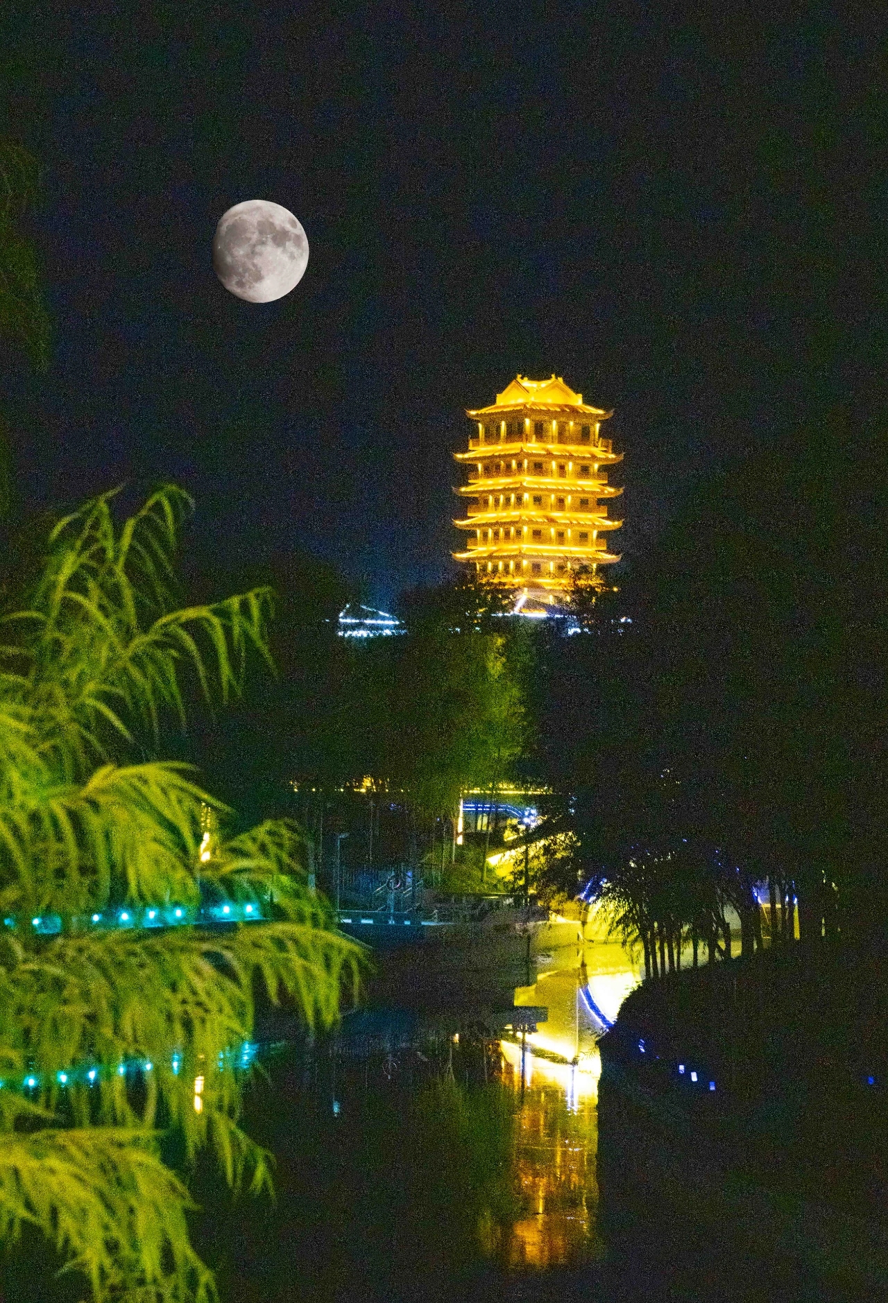 与关楼、石桥等暖黄的灯光