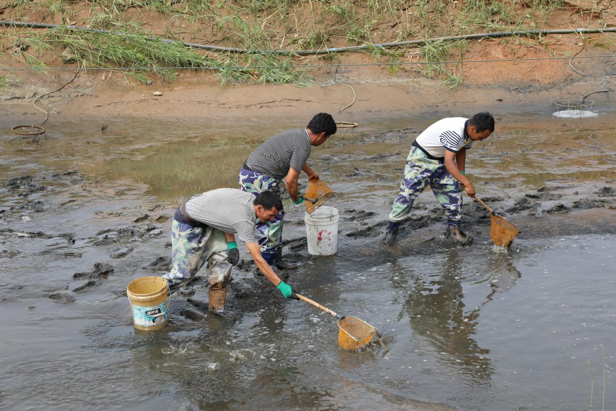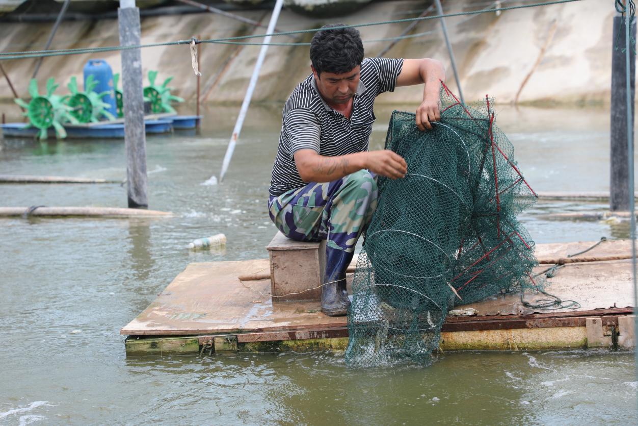 工人在养虾池捕捞红螯螯虾。朱志升 摄