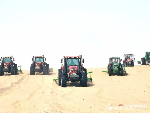 在后河坝二期治沙现场,亚森·奥斯曼联合其他承包户,集合了17辆拖拉机平整沙地。拖拉机一字排开向前推进,场面非常壮观。