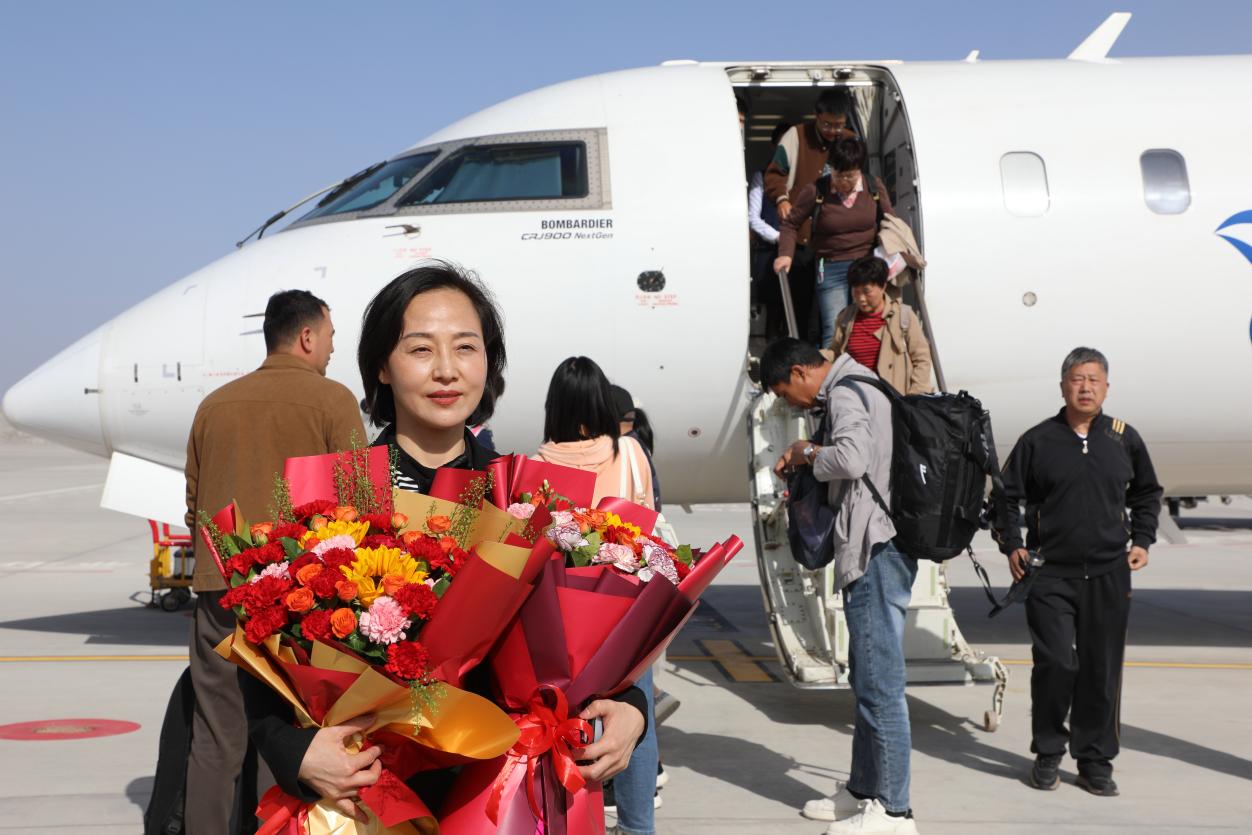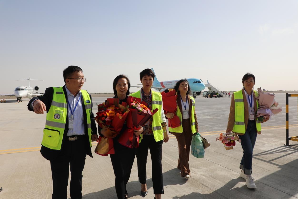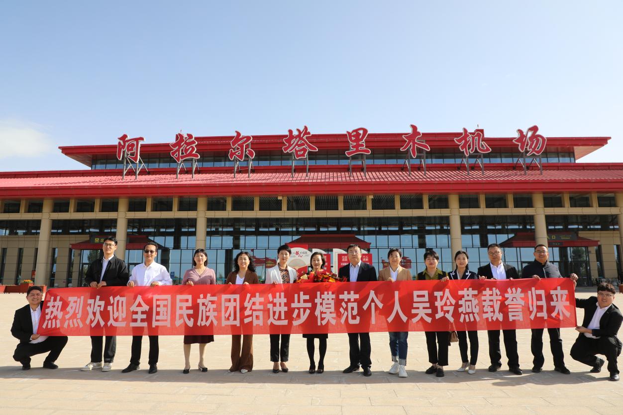 10月4日,新疆兵团第一师阿拉尔市党委统战部、卫健委、第一师医院、浙大邵逸夫阿拉尔医院等单位相关负责人及职工代表在阿拉尔塔里木机场迎接参加全国民族团结进步表彰大会归来的模范个人吴玲燕,献上鲜花祝贺并合影留念。