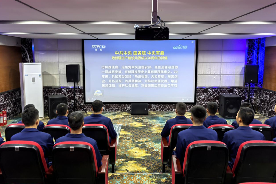 阿拉尔市消防救援大队收看庆祝新疆生产建设兵团成立70周年大会新闻。王芳芳 摄