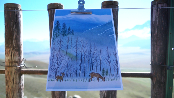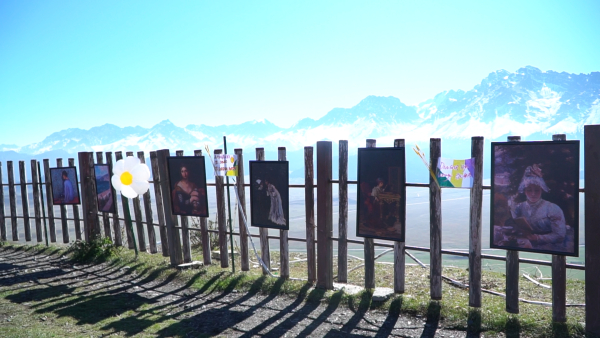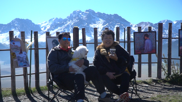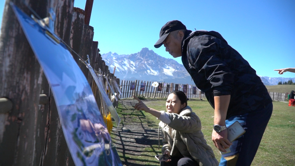 游客王曦、徐小烨说:“看完风景没想到这里还是有一片画展,属于是意外的惊喜。而且画展真的画得很美,就是人物风景什么的都有,很适合打卡拍照。我看到好多人在这边打卡拍照,配着后面的雪山就是非常出片。”(记者 阿那尔 常乙 报道)