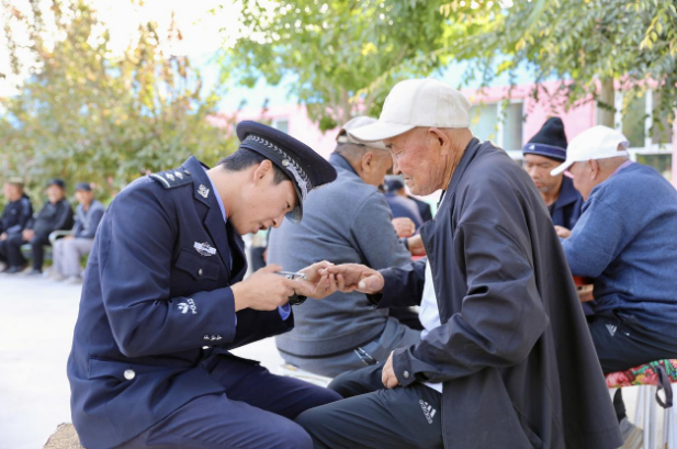 温宿县公安分局组织民警走进敬老院,给老人送关爱、送温暖,宣传反诈知识。夏二盼 沈丹 摄