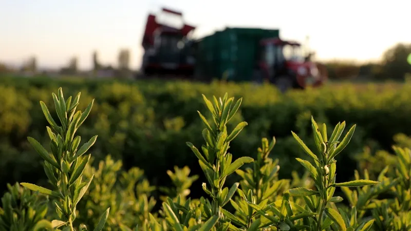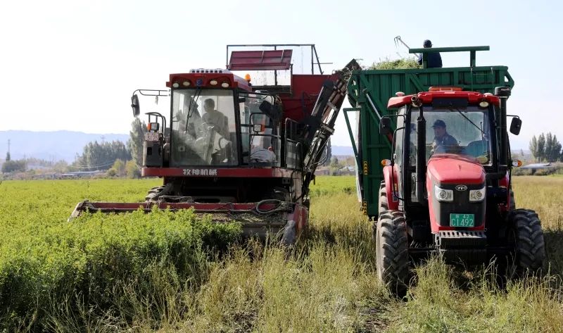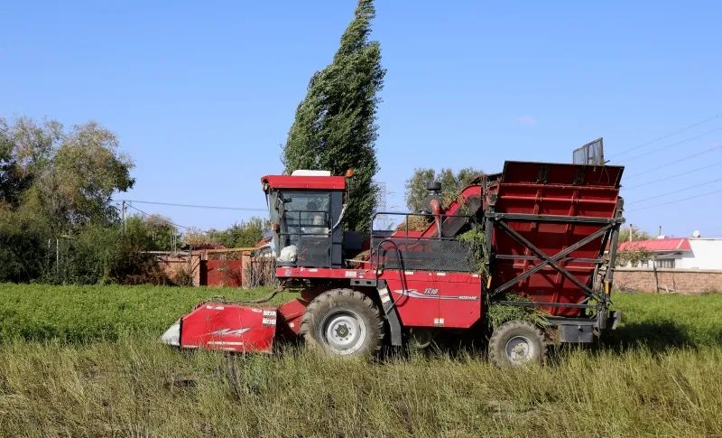 连日来,在沙湾市乌兰乌苏镇皇宫新村的甜叶菊种植基地,成片绿油油的甜叶菊紧紧相拥,淡淡的清香沁人心脾。种植户利用晴好天气抓紧采收,收割机在田地里来回穿梭,将脱秆后的甜叶菊倾倒在运输车斗内,运到晒场上晾晒,现场一派繁忙的丰收景象。