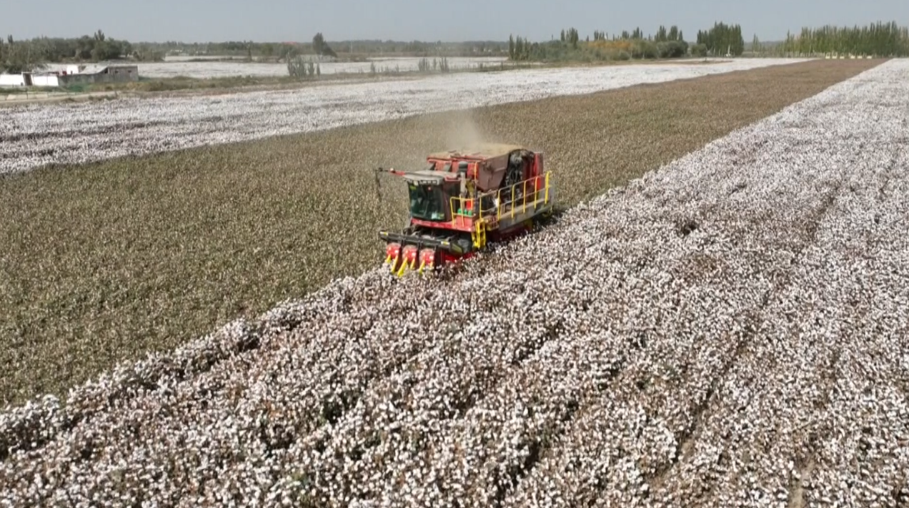 连日来,全国优质棉生产基地之一的巴楚县148.5万亩棉花喜迎丰收,万顷“棉海”里采棉机高效作业,确保朵朵新棉及时归仓。一望无际的棉田里,数台国产采棉机正在高速运转,将一朵朵洁白的棉花收入囊中。今年,巴楚县棉花种植机械化率已达100%,采收机械化率达到了91%,以往人工采收50亩地需要12人工,2个月时间才能采收完,现在采棉机采收仅用时5个小时,机械化采收不仅提高了效率,也减轻了人工负担。