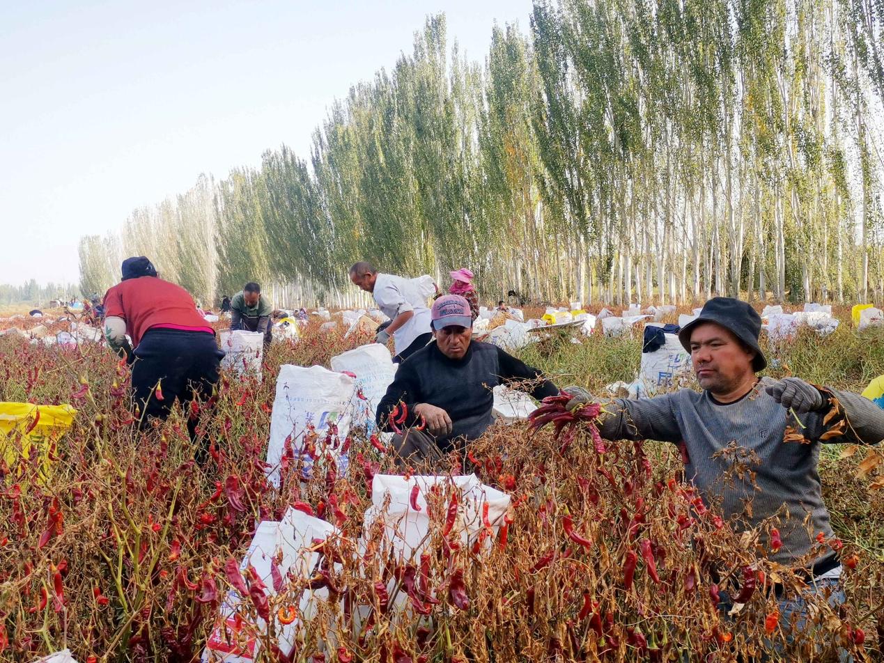 在辣椒地中,红红绿绿的辣椒挂满枝头,长势喜人。农户拎着袋子穿梭来往于一排排辣椒间,正在采收红彤彤的成熟辣椒,“我们家就住在旁边,我们每天来摘辣椒,多一份经济收入,空闲的时候还能照顾到家里,我觉得很开心。”阿依古丽·吐尔迪说。