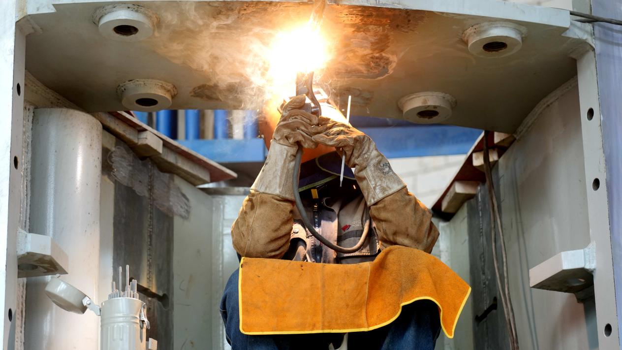 新疆大石峡水利枢纽工程发电机组,施工人员正在焊接发电机转子。赵新昌 摄
