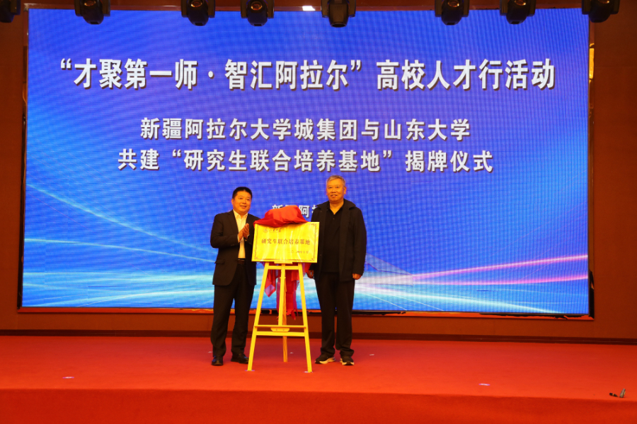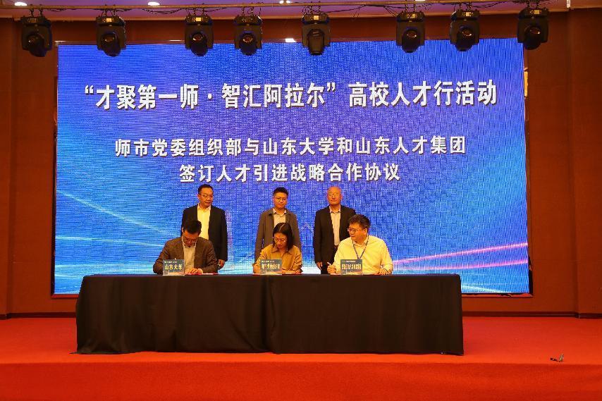 开幕式上,与会嘉宾观看了第一师阿拉尔市人才宣传专题片,师市相关部门负责人详细介绍了阿拉尔市的发展前景、产业优势以及人才政策。随后,师市6个代表单位依次上台介绍企业的发展情况和人才需求,5所来访高校代表单位作学校介绍。其间,第一师阿拉尔市党委组织部与山东大学和山东人才集团签订三方人才引进战略合作协议,举行了阿拉尔大学城集团有限公司与山东大学共建“研究生联合培养基地”揭牌仪式。