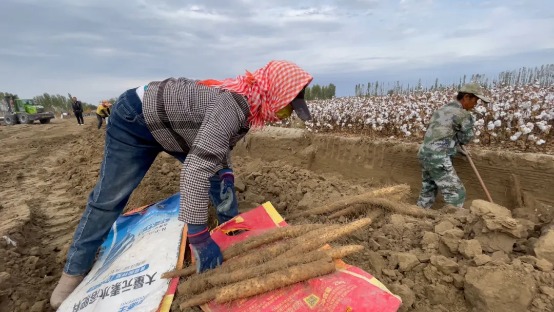 10月13日,在老沙湾镇十坪口新村,山药像一排排的“绿墙”郁郁葱葱,村民们正忙着挖山药、修须条。新挖出的山药裹着的泥土被整齐地码放在地头,村民们脸上洋溢着丰收的喜悦。