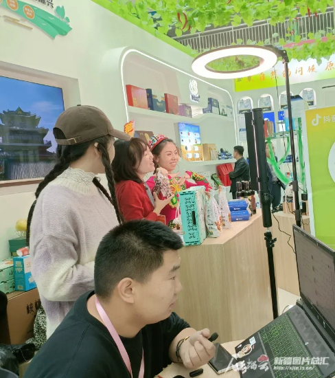 第十届新疆特色果品(阿克苏)交易会上,来自浙江省温州市的带货主播与拜城县电商团队合作,一起推介销售阿克苏特色农产品。 陈疆林摄