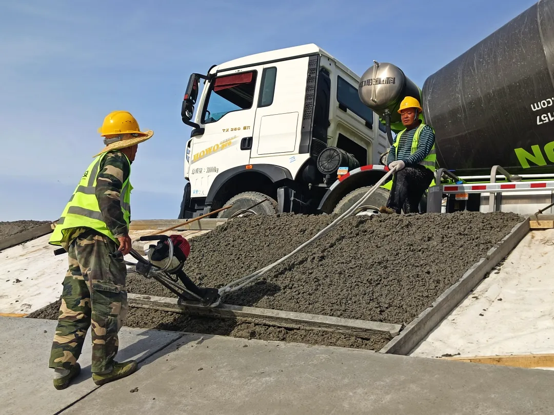 工人正在进行渠道混凝土浇筑、平整等工作。