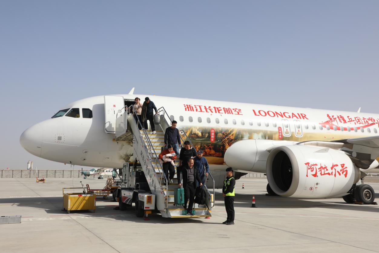 乘坐“阿拉尔号”的首批游客走下飞机。朱志升 摄