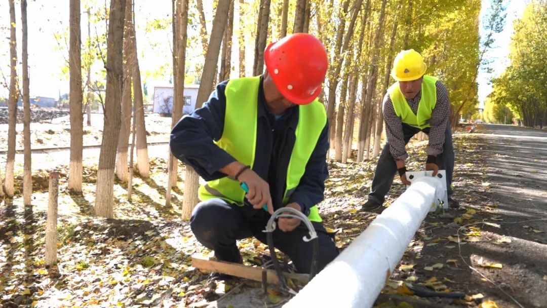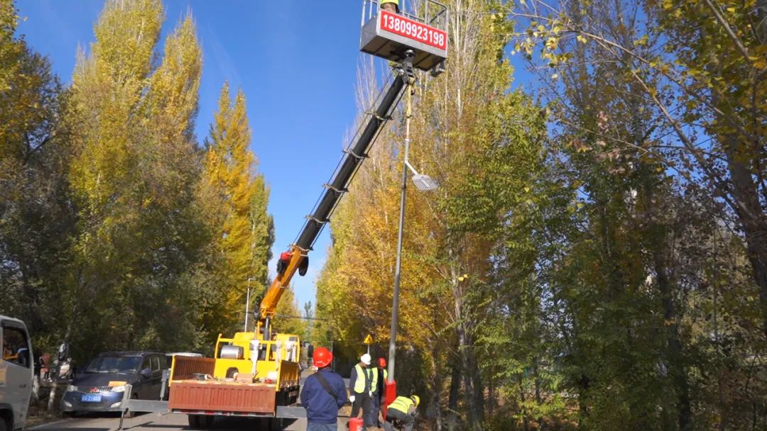 10月25日,在沙湾市东湾镇东卡线路段,工人们与机械密切配合,正在紧锣密鼓的安装路灯。