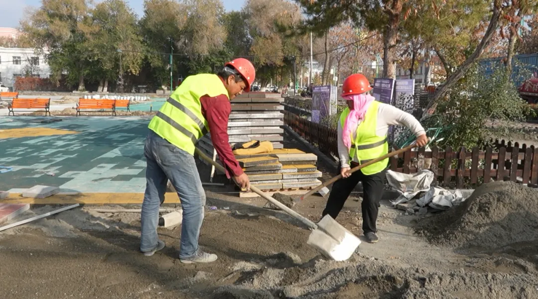10月27日,在沙湾市安集海镇文化体育健身中心基础设置提升改造工程施工现场,记者看到工人们正忙着铺设花砖、安装健身器材。