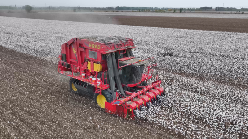 10月26日,在沙湾市大泉乡烧坊庄子村的一处棉田里,一台国产打包式采棉机不停地穿梭忙碌。这台打包采棉机被农民亲切地称为“下蛋机”。它的与众不同就在于它能一边采收,一边把棉花进行打包,地里转几个来回,一个两吨左右的棉团就落地了。