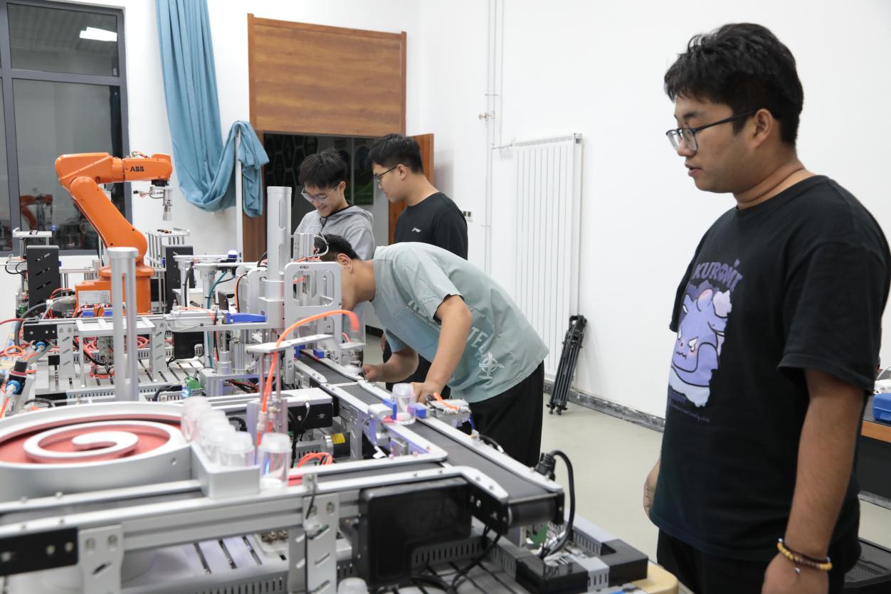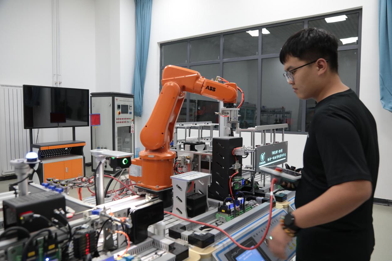 在塔职院实训楼,荣获大赛金奖的参赛师生正在进行下一阶段的学习和设计研究。参赛团队中,负责工业机器人程序编写及调试的技术员代贝宁展示了工业机器人的工作原理。