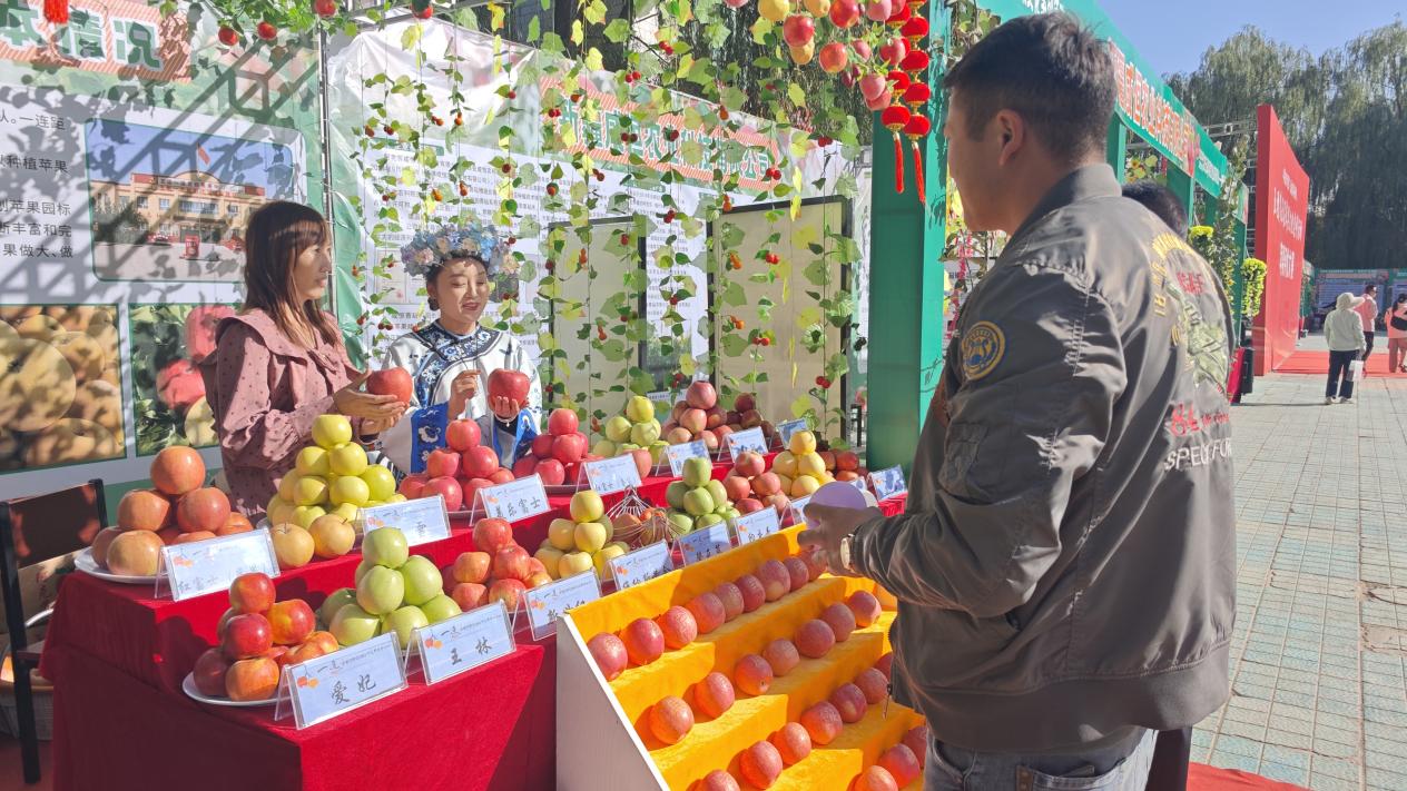 五团沙河镇展销会上,种植户员向游客介绍自己连队苹果的优势。 王芳芳 摄