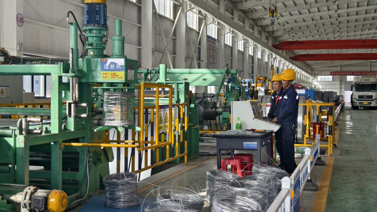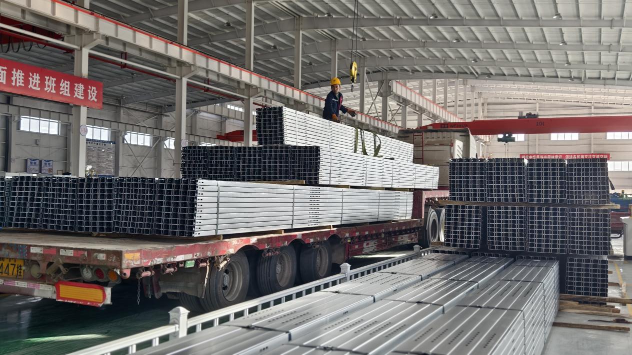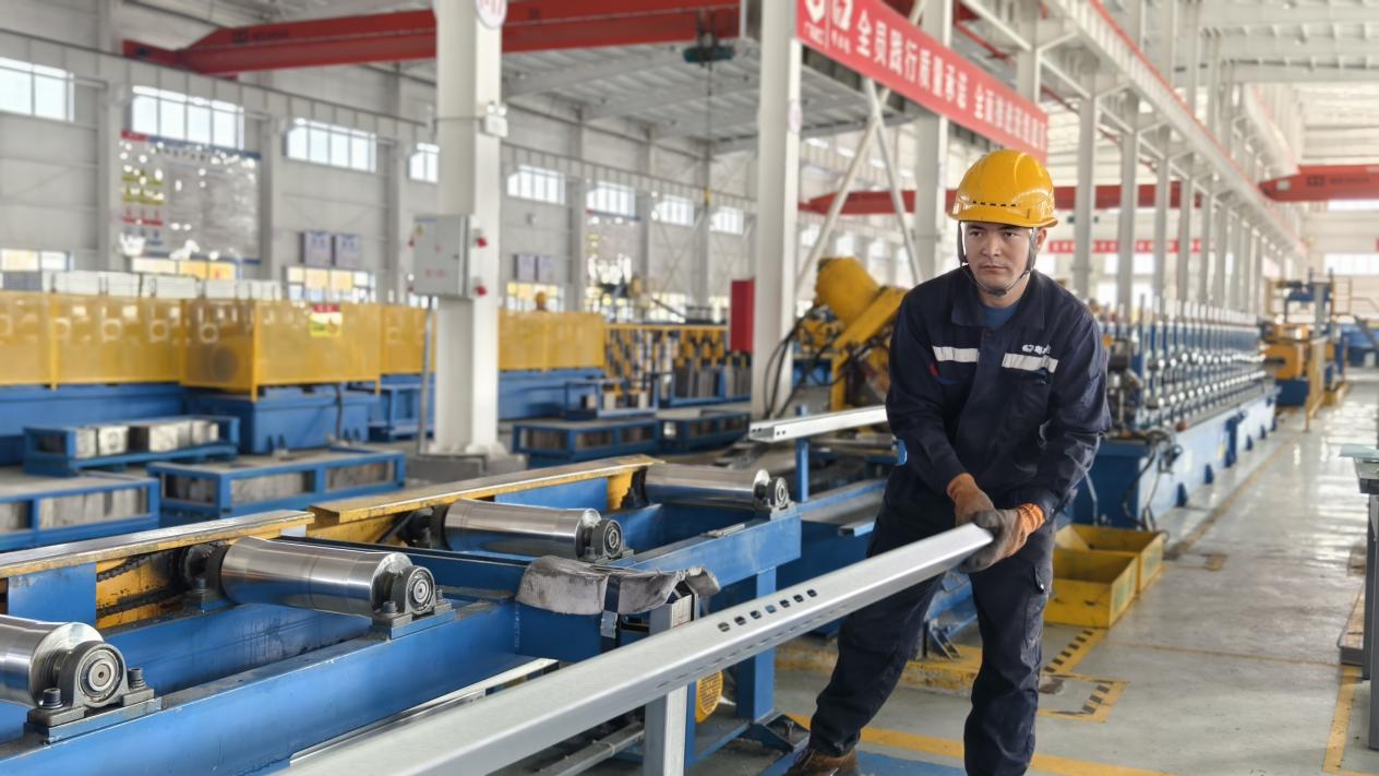 厂房一端是一捆捆即将出厂的光伏支架整齐排列,吊车来回运转,光伏支架成品堆放的高度不断上升。另一端则见一圈圈锌铝镁材料由大变小,在高速运转的冷弯成型生产线中,形成一根根规格统一的光伏支架。工人们按照生产加工顺序,正忙着配合生产线将半成品传送到下一道工序进行加工。