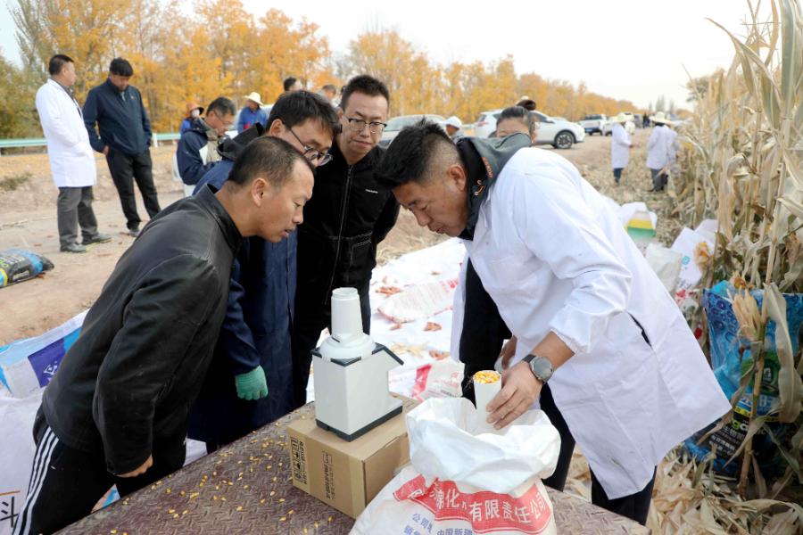11月15日,新疆兵团农业农村局组织塔里木大学、石河子大学、兵团农业技术推广总站、第四师农业科学研究所等单位的专家组成专家组,对新疆农垦科学院联合第一师阿拉尔市农业农村局、第一师农业科学研究所在第一师阿拉尔市二团新井子镇创建的麦后复播玉米百亩示范田进行实收测产,复播玉米平均亩产达到1027.58公斤,算上第一茬冬小麦821公斤产量,周年亩产达1848.58公斤,该产量实现了新疆麦后复播玉米新突破,成为新疆目前最高纪录。